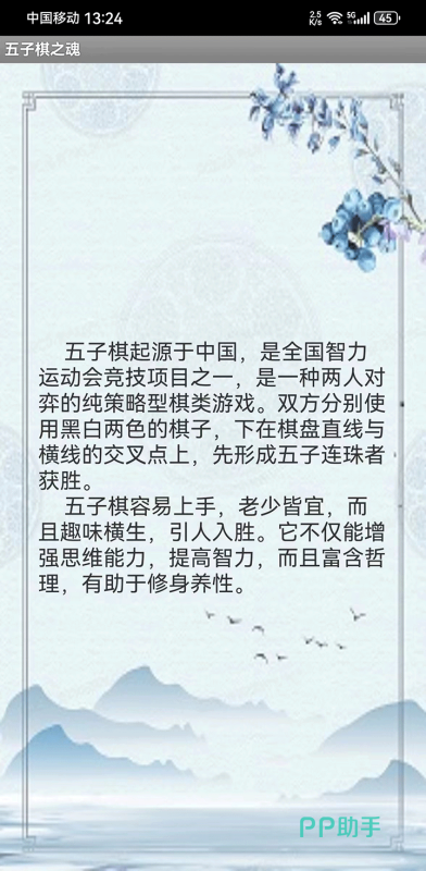 非常梦幻的一款画面,在游戏中的玩法仍然是以经典的五子棋形式为主。黑白两色的棋子在走棋的时候,玩家应当注重防守,需要有智慧性的去进行游戏,每一次胜利之后玩家还可以获得一定的等级,在这款专业的棋盘上,玩家可以不断的学习。会有大量的棋谱等待着玩家来研究,如果是想要挑战高难度的话还可以进入残局。