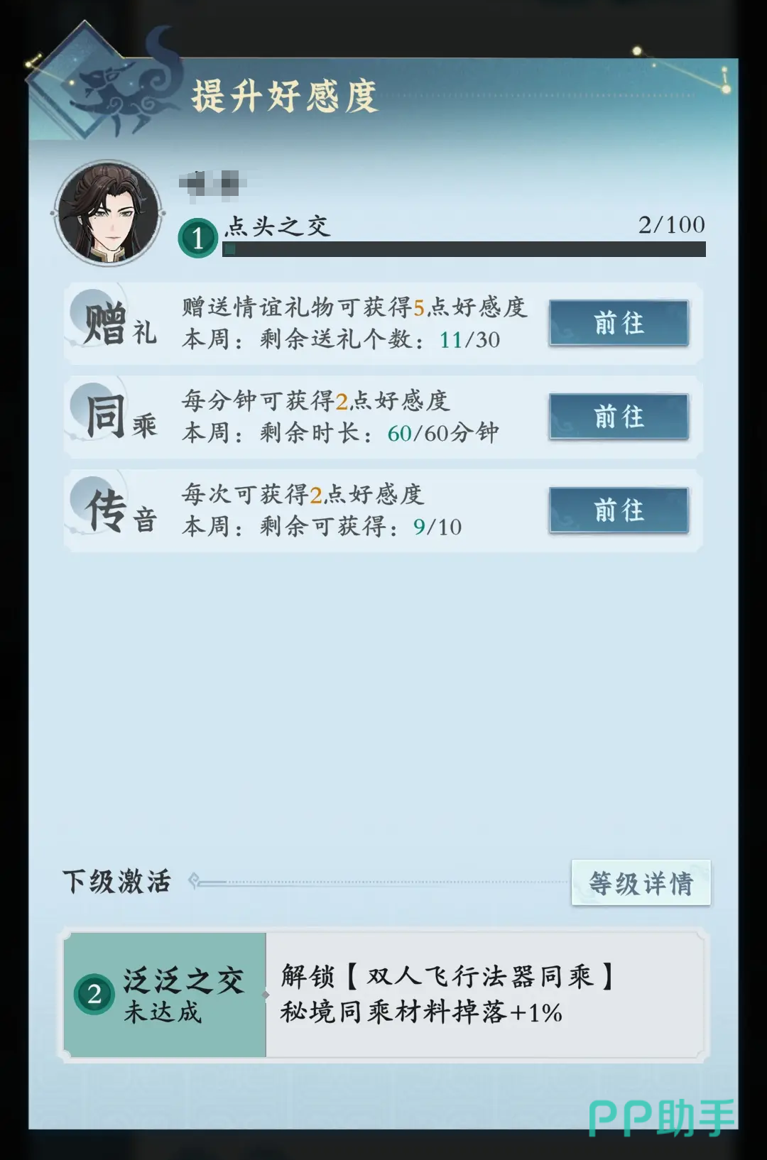 首先最基础的要求是大家一定要有一个道侣,因为有些任务是只有和道侣才可以做的。如果小伙伴们还没有激活的话,需要先和任意一位异性玩家的亲密度到500点,至于如何增加可以选择送礼物的形式,每个星期都可以送30个,一共有150点。此外还可以同乘,每个星期一起同乘60分钟就可以得到120点,这样一周就可以得到290点好友度了。