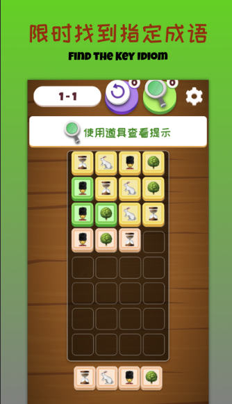 游戏通过点击方块,巧妙地将四字成语拼接完整。每一关都设有时间限制,玩家需在规定时间内做出选择,猜对答案方可通关。游戏不仅考验玩家的成语储备,还提供了多种难度选择,适合不同水平的玩家挑战自我。当倒计时即将结束,若仍未通关,玩家可利用金币购买道具,借助系统提示迅速突破难关。游戏中的道具系统设计巧妙,既能助力玩家快速通关,又增加了游戏的趣味性和策略性。