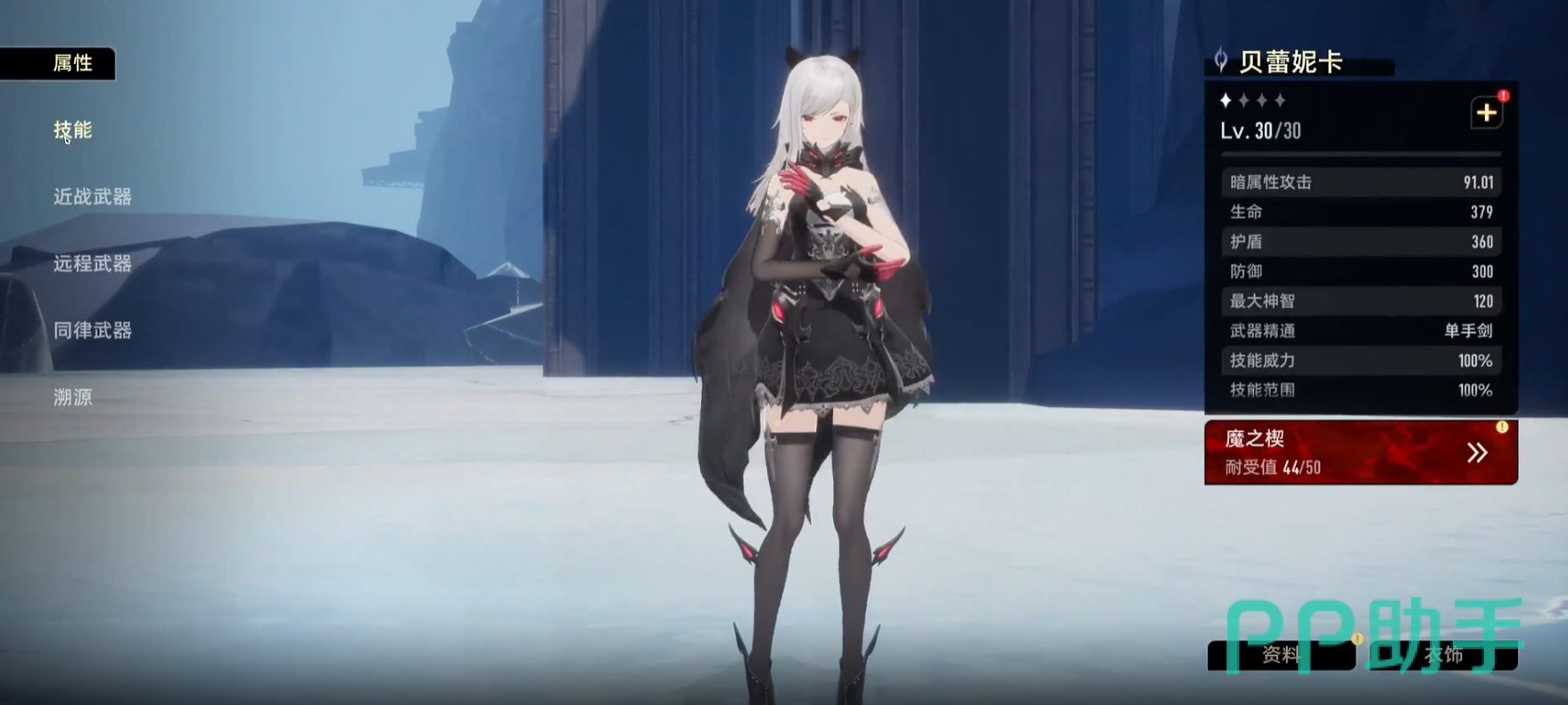 很经典的长发白毛角色,能力方面也是十分的简单粗暴。“残光”这个技能释放后,她会向前突进,使用“伊弥尔”沿途造成四次范围伤害。增益技能“冥焰”,将近战武器切换为“伊弥尔”并释放1道剑气,使用“伊弥尔”攻击时会朝着攻击的方向释放剑气,使用该武器的时间内,自身受到伤害时不会产生僵直,并持续消耗神志,甚至下降为0或再次使用此技能时收回“伊弥尔”。被动效果“回转”,效果比较简单,但是很实用,使用单手武器对敌人造成伤害时,有一定概率回复神志。
