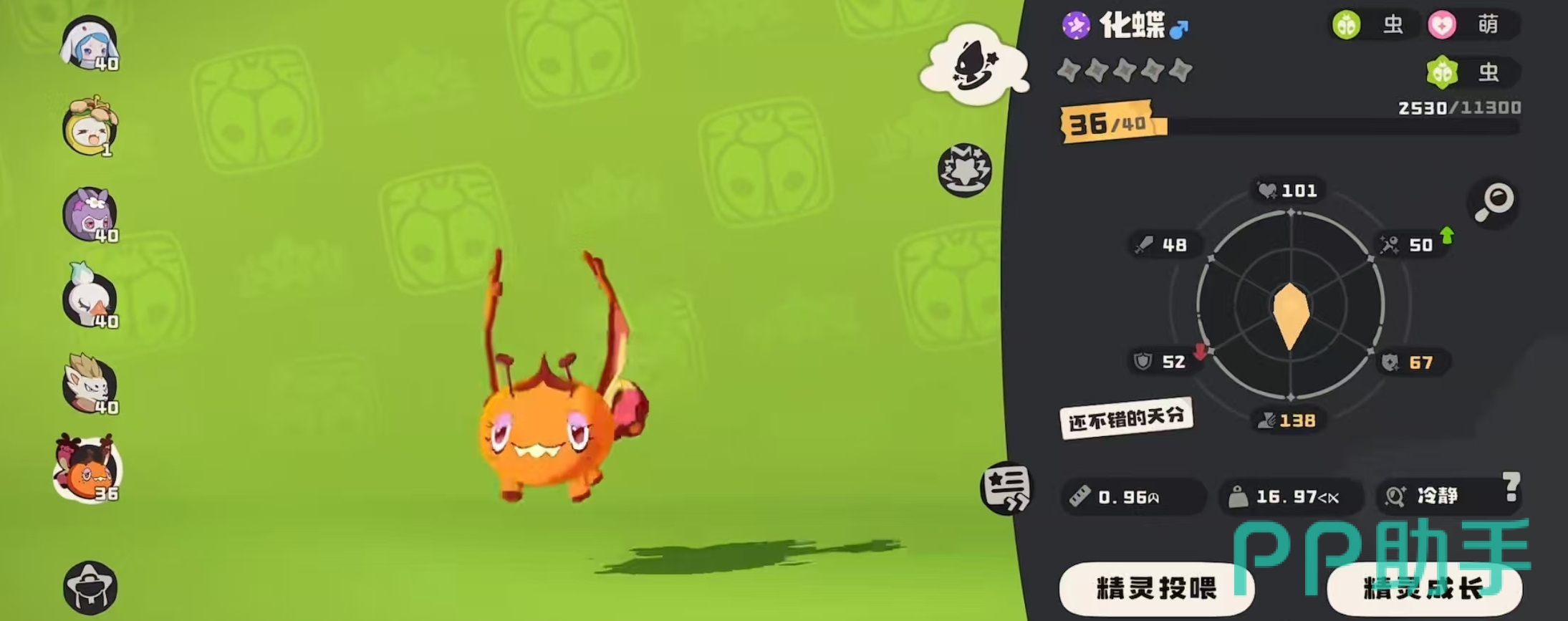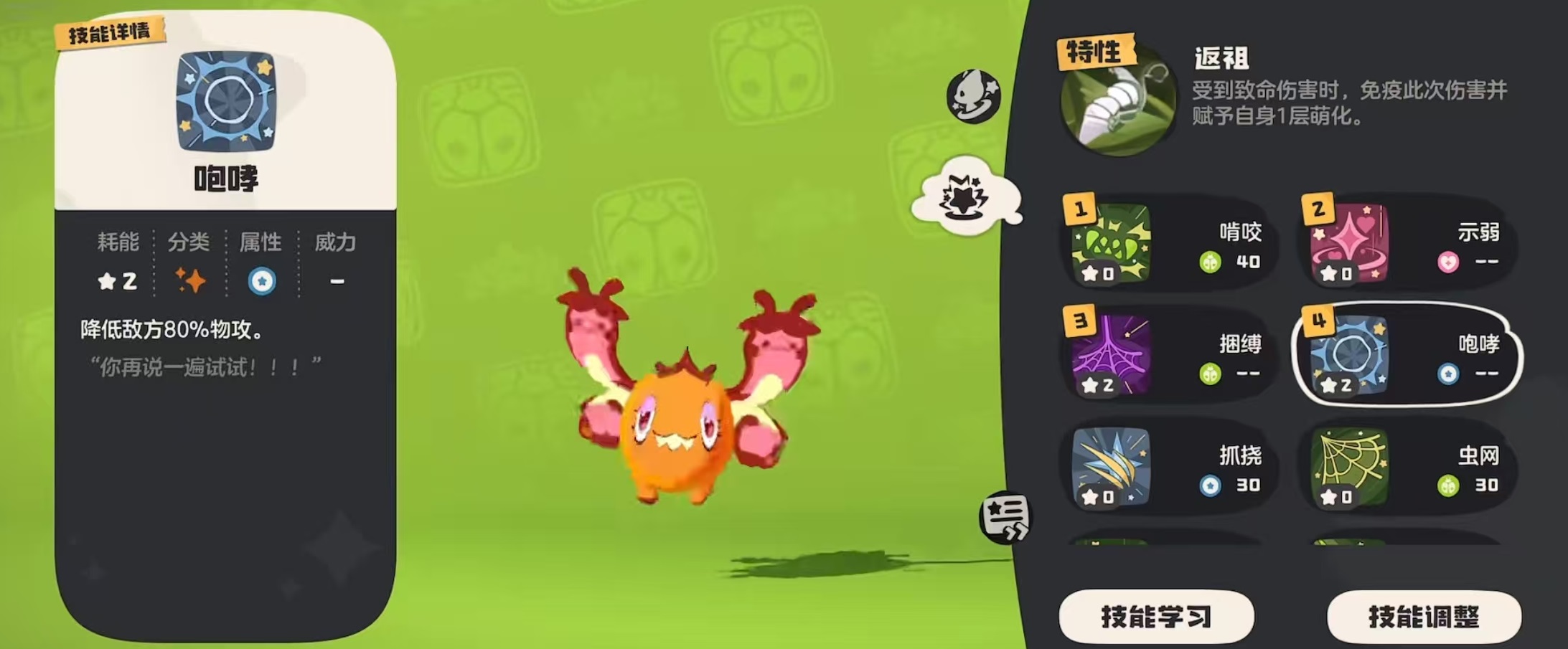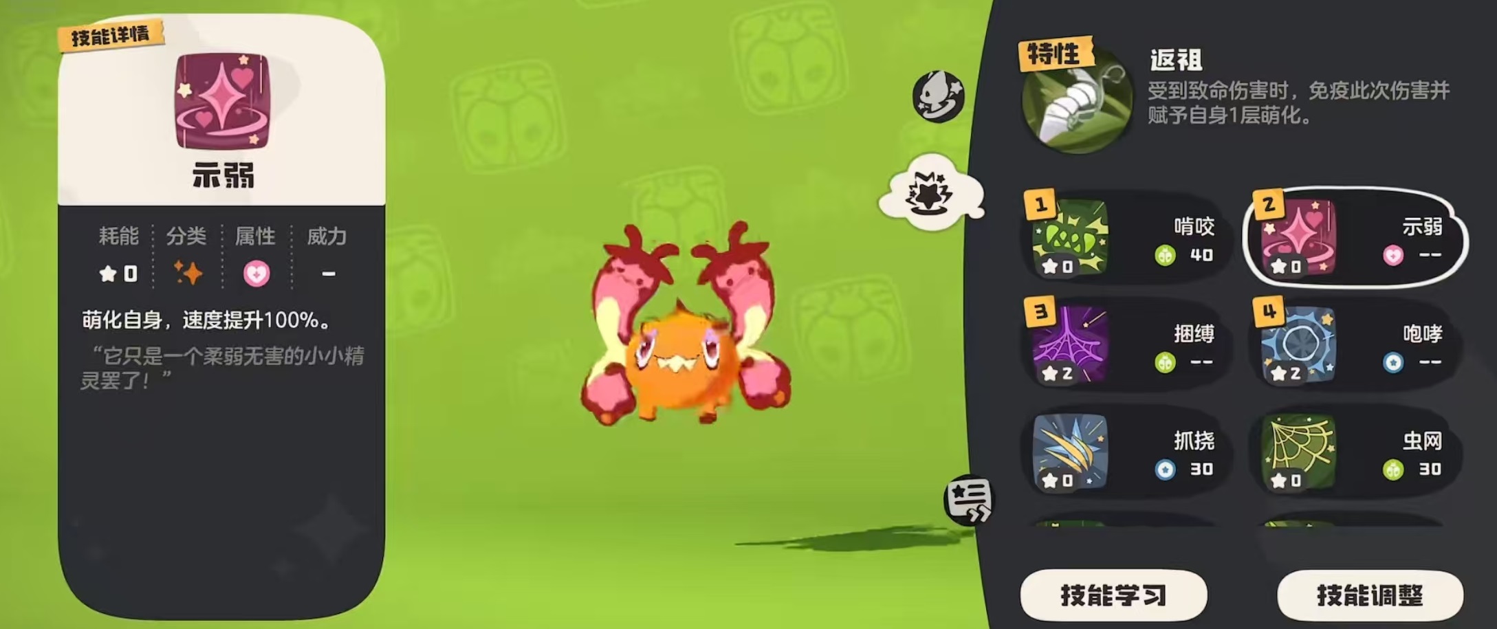 虫击,造成物理伤害,应对时无视敌方的系别抵抗。虫鸣,除了造成魔法伤害外,队伍中每携带一只带有此技能的精灵,连击次数就能增加1。应激反应,能回复30%血量,应对时回复达到90%。示弱,萌化自身,速度提升100%。装可爱,萌化自身,降低敌方50%物攻和物防。月之亮面,在自身带有萌化状态时,威力提升。