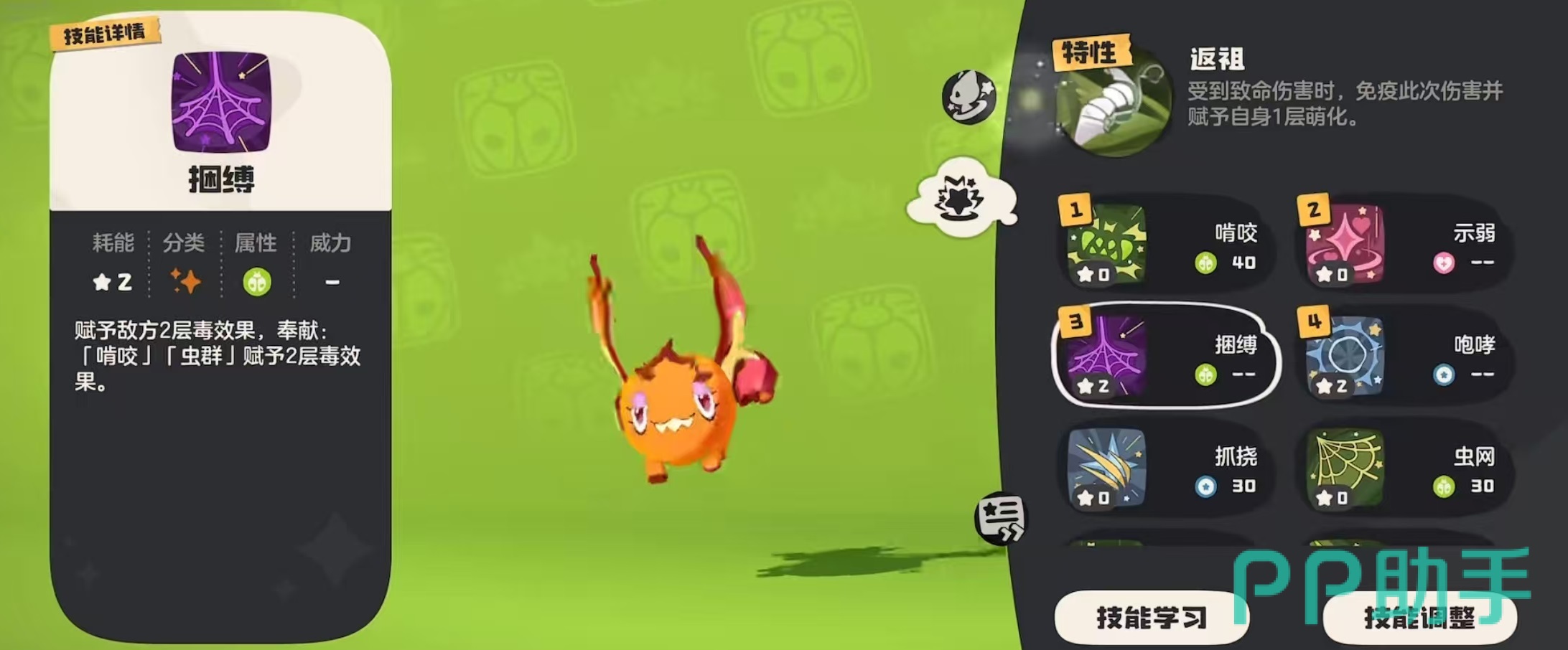 首先要了解的是自身的特性化茧,当受到致命伤害时,会将首次伤害免疫掉,并为自身添加一层萌化状态。这就意味着首次触发致命攻击时,并不会立即死掉。自身的血脉技能一共有5个,分别是捆缚,能给敌方添加两层中毒效果,如果是啃咬或是虫群,也能赋予两层中毒效果。引雷,造成魔法伤害,2连击,进场首个回合威力增加15点。龙吼,对目标造成物理伤害。闪光,能对敌方目标造成魔法伤害。汲取,除了魔法伤害外,还有100%的吸血效果。