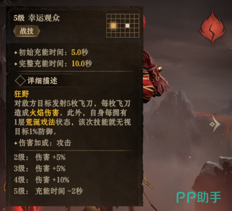 卡斯帕的职业定位可以归类为“火焰系爆发输出者”,他的技能围绕火焰伤害和狂野判定展开,通过技能叠加效果,不断提高自己的输出能力。他的被动技能“谁是演员”是整个技能体系的核心。当队友成功触发“狂野判定”时,卡斯帕将获得一层“荒诞戏法”状态,每层效果可持续20秒,最多可叠加13层。每层“荒诞戏法”都可以为卡斯帕提供13%的额外伤害加成,使他的输出能力在战斗中越战越强。卡斯帕的战技“幸运观众”进一步体现了他的高输出特性。他可以向敌人发射多枚飞刀,每枚飞刀造成高额的火焰伤害,并根据“荒诞戏法”的叠加层数无视目标的部分防御。这意味着在叠满状态下,他对高防御目标的杀伤力将十分恐怖。而大招“大咖登场”是他在战斗中实现爆发输出的关键技能。释放后,卡斯帕会在15秒内大幅提升自己的火焰伤害,并随着队友的狂野判定频率,追加额外的飞刀攻击,从而形成恐怖的伤害链。