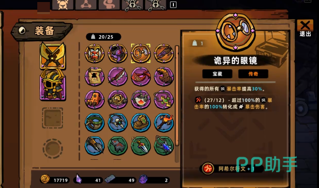 核心道具为“吸魂之楔”,不仅有残血吸血,还可以增加防御和攻击力,是一个残血很好用的神器,当然这个流派也并不一定非得是用吸魂之楔,即便是没有这个道具也是输出比较足的,只要熟练度高能躲过攻击。然后是“眼镜”,可以加暴击率,并且暴击率溢出的话会转而增加暴伤,非常给力。以及“无形之刃”,30%攻击力加成,这三个道具基本上是必带的,构成了这套流派的基础。