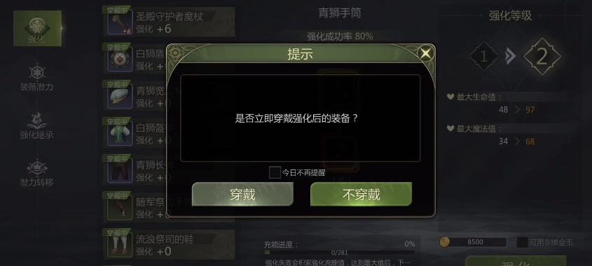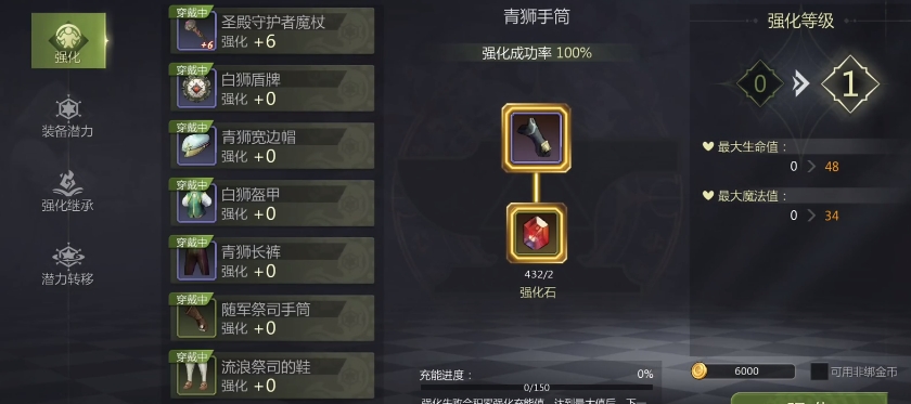 在拥有足够强化资源以后就可以着手准备去进行装备方面的强化了,其中建议是优先把装备都提升到加5的程度,因为前期基本都是包上的,能让大家的战力最大化,在前期推进过程中会顺利许多,后面的话可直接用粉尘购买强化石来快速提升装备等级。