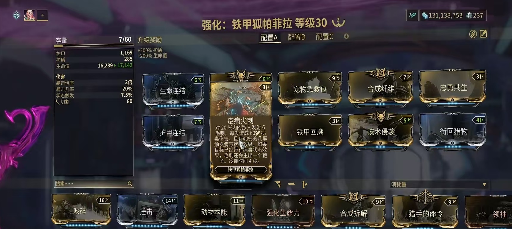 然后是铁甲回溯,这个技能是铁甲狐可以陪伴大家一直战斗的原因,在死亡之后并不会消失,而是化为幼体状态,朝着敌人吐出毛刺,每发毛刺都可以造成病毒伤害,在30秒之后,铁甲狐就以真实形态复活了。第3个技能疫病尖刺,对20米内的敌人发射毛刺,每发都可以造成病毒伤害,而且有40%几率触发病毒状态效果。如果此时目标身上已经带有病毒状态,那么毛刺还会生出一个孢子,冷却时间4秒钟。这个病毒效果是可以一直叠加下去的,最多能叠加到10层。所以在异常状态添加方面,有着非常出色的表现。