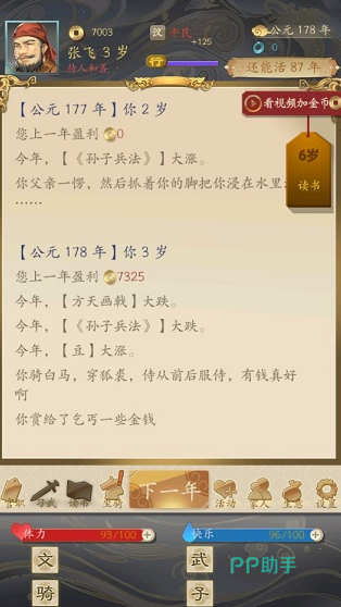 一款深度人生模拟类手机游戏,玩家会亲身步入一位三国豪杰的童年,伴随角色一步步成长,以多样化的视角体验英雄辈出的时代纷争。游戏巧妙地融合了文字叙述与精美图片,让每位玩家都能自主规划属于自己的三国旅程。游戏引入了策略性战斗机制,玩家根据对手的独特性以及战场的具体条件,细致地规划战略安排。同时,玩家能够自由选择各式各样的武器与装备,以灵活应对各种战斗场景。
