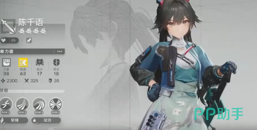 陈千语有着超高的武艺和乐观的性格,不管是身处什么样的环境,经历了什么样的遭遇,她都会坚持自我,永不退缩,她的主动技在释放以后会立刻闪现到敌人的身边,对其打出200%的物理伤害,同时敌人还会遭受到1秒的击飞,如果这位目标此时正好处于破韧状态中,那么还会有30%的几率生成结晶能量,她的终结技在四方后会先将敌人给击飞,随后对其展开八次斩击,每一次斩击都会让敌人承受攻击力为70%的物理伤害,并且第一次斩击会给敌人添加伤韧效果。