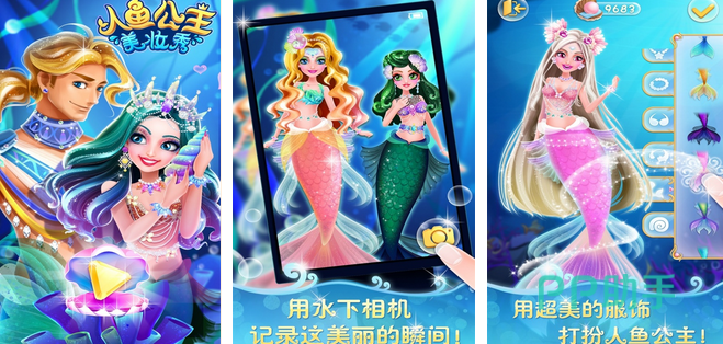 在华丽的海底场景当中,玩家根据自己的喜好打扮成不同风格的人鱼公主。不同于其他公主,玩家可以挑选各式各样的鱼尾,数量高达一百多种,整体的色调以粉红和绿色为主。在化妆方面,玩家可根据海底的背景来打造更加具有魅力的人鱼公主形象,化妆工具也是非常齐全的。玩家还可以用水下相机记录美好瞬间。