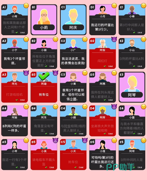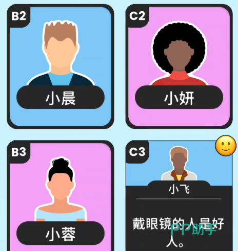 进入这个关卡之后咱们首先可以看到C3的小飞会说戴眼镜的都是好人。因为这是第一个证词,所以肯定为真的,那么看人物可以确定A2,C1和A3这三位都是戴眼镜的,所以他们不会是卧底。同样他们的证词也绝不会有问题,接着咱们来看他们的证词,首先看A3,她会说她这行的都是好人,那么A3,B3和C3都不会有问题。A2的证词没什么意义,咱们可以直接跳过。最后来到C1,他的证词说他的邻居之中只有一个人会是坏人,他的邻居是C2,B1和B2,这两个都是咱们需要重点观察的。