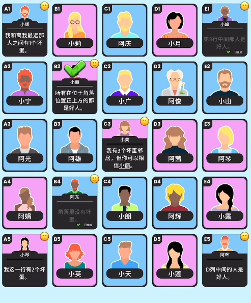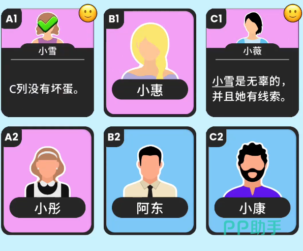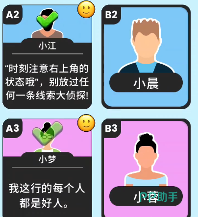 这关只有6个角色。一开始的证词是由C1提供,她说A1是好人,这个证词可以让我们放心查看A1的证词。之后咱们去点击A1,她会和我们说C列里面是没有坏蛋的,这样C2的嫌疑便可以被排除了。下面C2会说他的左手边是好人,那么B2的证词就没问题了。B2会让我们确认目前还剩下的坏蛋人数,游戏还剩下两个卧底。而没排除嫌疑的便是B1和A2,所以这两位便是这个关卡里面的两个卧底,此关的难点不高,主要需要咱们一个个的进行排查便可以得出最后的卧底了。