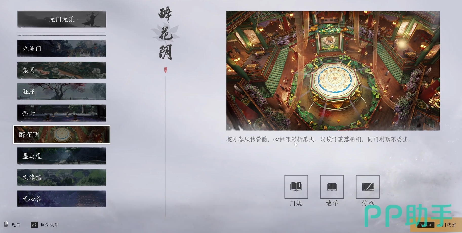 该门派的独门武学是使用伞这类奇特武器的九重春色,具有着很强大的远程能力,而且普攻时能漂浮在空中的特性,也令玩家在对敌时会较为的安逸,甚至在对手没有对空手段时都不需要进行太多的走位,也使得该武学很受欢迎。