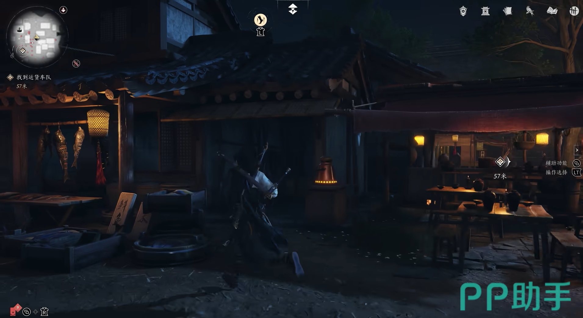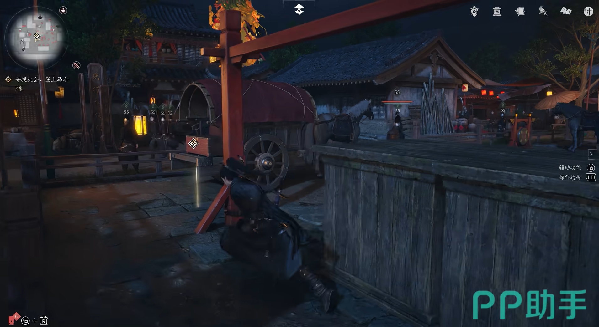 具体方法如下,只要玩家将视角往上移一些,并在街道上慢慢移动,就会看到屋顶上会出现一个落脚点的标识,按提示就可让角色直接翻身上去。翻身上了房顶后,玩家可顺着房顶来到货运马车的后方,便会发现挂着灯笼的木杆上也有落脚点提示,进而就能让自己翻到对面的房顶上,按同样的方法再来到另一处的木杆。