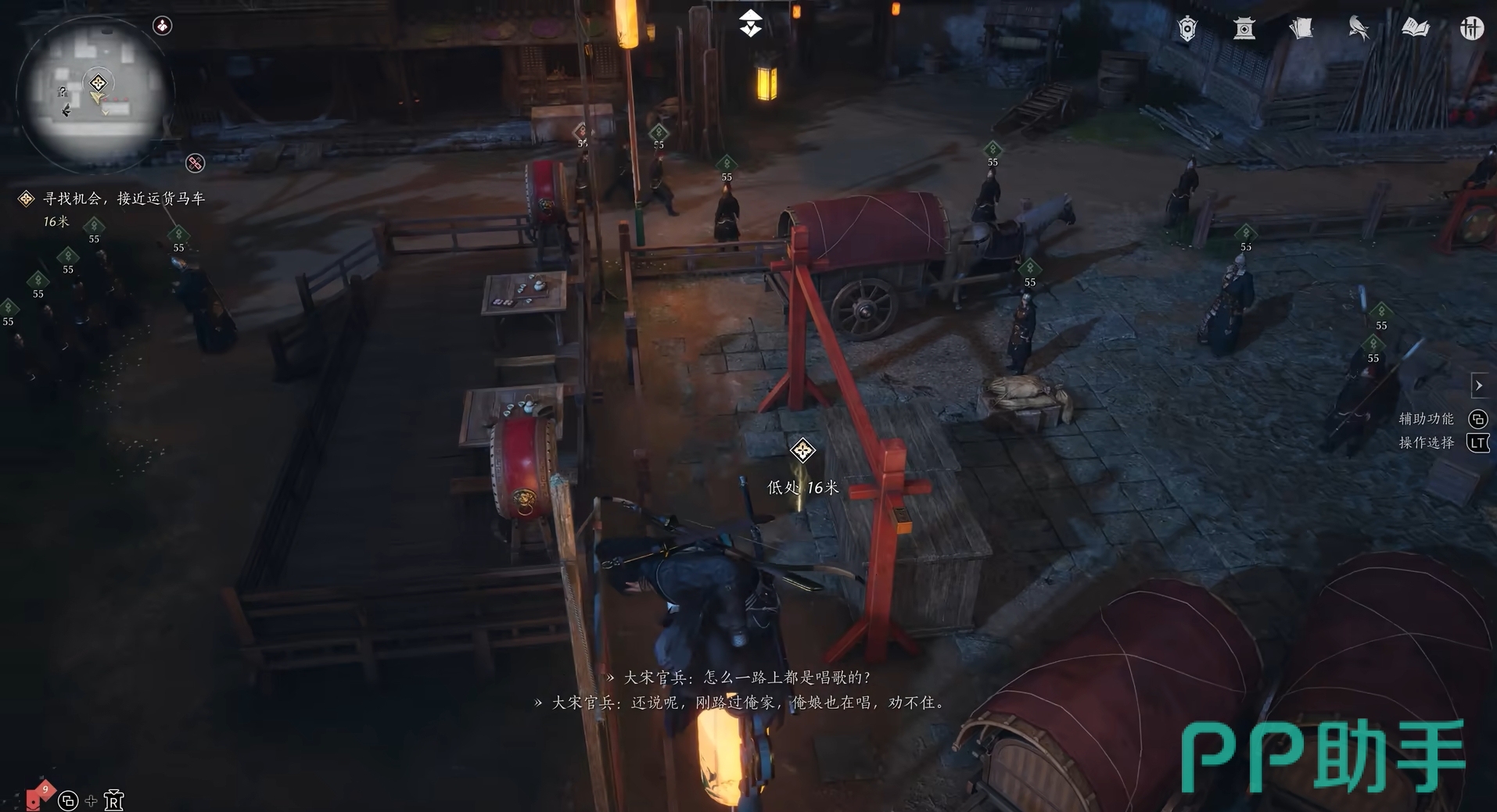 当玩家发现货运马车的位置后,会发现敌人已经将马车周围保护得严严实实,很难从地面用常规方法来接近货运马车,更别提潜入进去了。因此,最好的办法就是通过周围的屋顶,从空中利用跳跃和轻功来完成潜入。