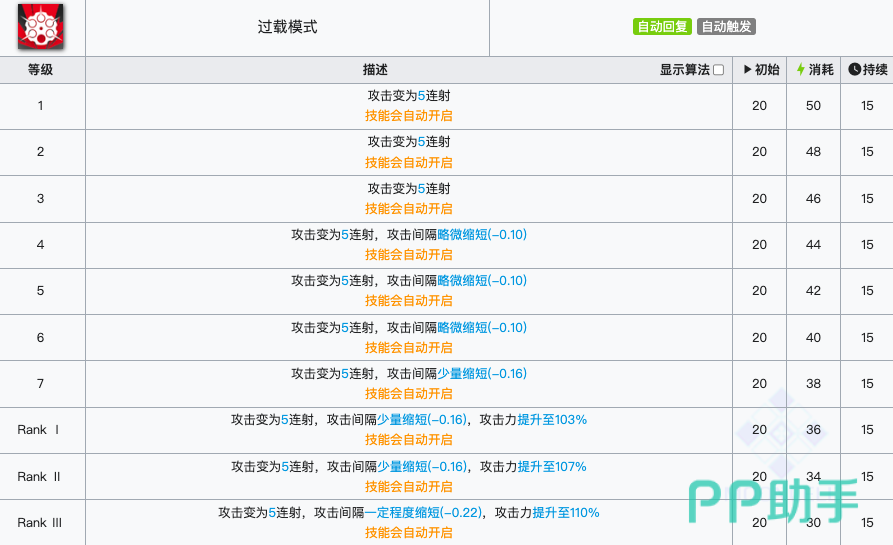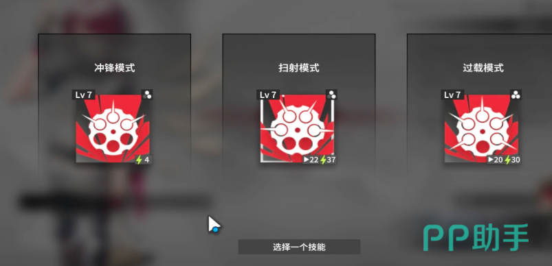 目前在游戏当中一共有三种技能,第一冲锋模式,第二扫射模式,第三过载模式。先来说冲锋模式,在结束第一次攻击后使用冲锋模式就可以让下次攻击变为三连胜,而且伴随着等级的提升每次射击造成相当于攻击力150%~145%的伤害,也就是说每提高一个等级则可提升2%的伤害值。