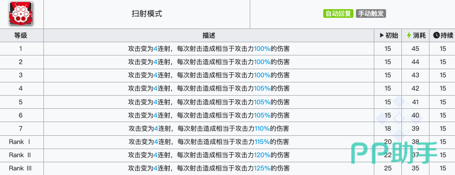 第二技能是扫射模式,目前有自动回复和手动触发两种,在攻击变为四连射后,每一次射击造成的攻击力伤害时会增加,最高等级则可以造成相当于攻击力125%的伤害。