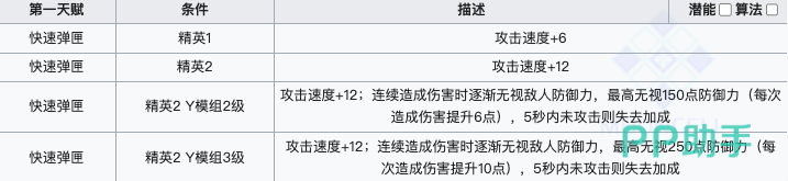 目前他的第一天赋技能是快速弹夹在攻击速度上提升。12连续造成伤害时逐渐无视敌人的防御,最高无是250点的防御力,每次所造成的伤害可提升6点,但需要提醒玩家,5秒内如果未达成攻击效果则会失去加成。