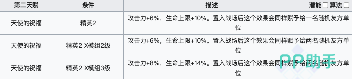 第二,天赋技能天使的祝福,当升至最高等级后攻击力可增加8%,生命上限可增加14%,再进入到战场当中后,这个效果会赋予给其他两名随机的友方单位,在团队作战当中整体表现还是非常突出的。