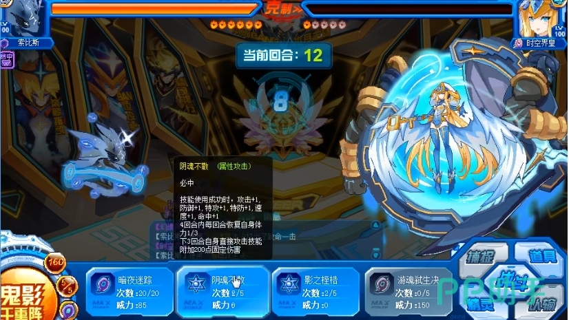 阴魂不散这个技能可以让索比斯全属性+1,并且在4回合内每回合恢复自身最大体力的1/3,下3回合自身直接攻击技能还会附加200点固定伤害,这种全属性强化+续航的组合是比较常见的套路,而附加三回合攻击200固伤的效果,主要是为了配合大招进行输出,毕竟暗影系的打击面相对较窄,需要通过这种方式来提升输出能力。