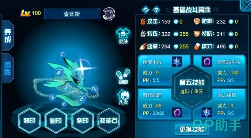影之桎梏是一个相当实用的技能,4回合内免疫异常状态,下3回合自身受到的伤害减半,并且命中后有70%的几率令对方害怕,四回合的免控能力无需多言,三回合的减伤效果则是对旧技能魂之形态的一种致敬,同时也弥补了索比斯双防较低的劣势,至于70%的害怕效果,原本并没有打算让索比斯成为控场精灵,但考虑到平民精灵以及暗影系属性本身的缺点,还是觉得增加一些控场能力会更好,这也是其速度种族达到122的原因所在。
