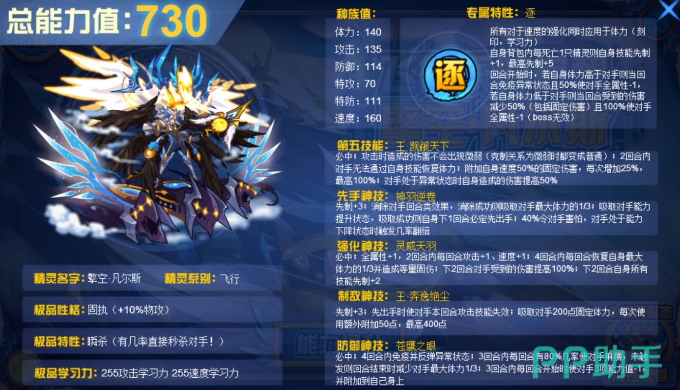 而当自身体力低于对手时,它则能在当回合减少50%所受到的伤害,包括固定伤害,并且100%使对手全属性-1,从技能方面来看,神羽逆卷是其一大杀器,该技能拥有先制+3 的效果,它可以消除对手的回合类效果,一旦消除成功,便能吸取对手最大体力的1/3,这种对敌方状态的干扰与自身血量的补充双重效果,同时该技能还能够吸取对手的能力提升状态,若吸取成功自身在下1回合必定先出手。