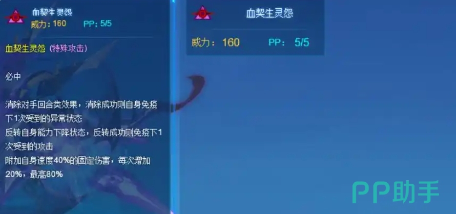 血契生灵怨是必中技能,能消除对手回合类效果,消除成功后自身免疫下1次受到的异常状态,还能反转自身能力下降状态,反转成功则免疫下1次受到的攻击,同时会附加自身速度值40%的固定伤害,每次增加20%,最高可达80%,第五技能的核心是反弱,解决了这个精灵怕弱化的问题,整体以封属、断回、消耗次免来达到控场的目的。