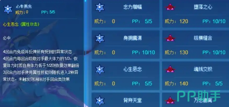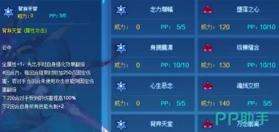 心生恶念是一个4回合的弹控技能,具有吸血、续航以及低体续航翻倍的特点,在3回合内,若对手使用属性技能,则会随机进入2种异常状态,若未触发异常状态,则会消除对手回合类效果,这算得上是一个主动条件控场技能,背弃天堂是全属性+1的技能,先手效果翻倍,4回合结束时还会附加250固伤,若对手未使用攻击技能,则粉伤效果会翻倍,下两回合先二增伤。