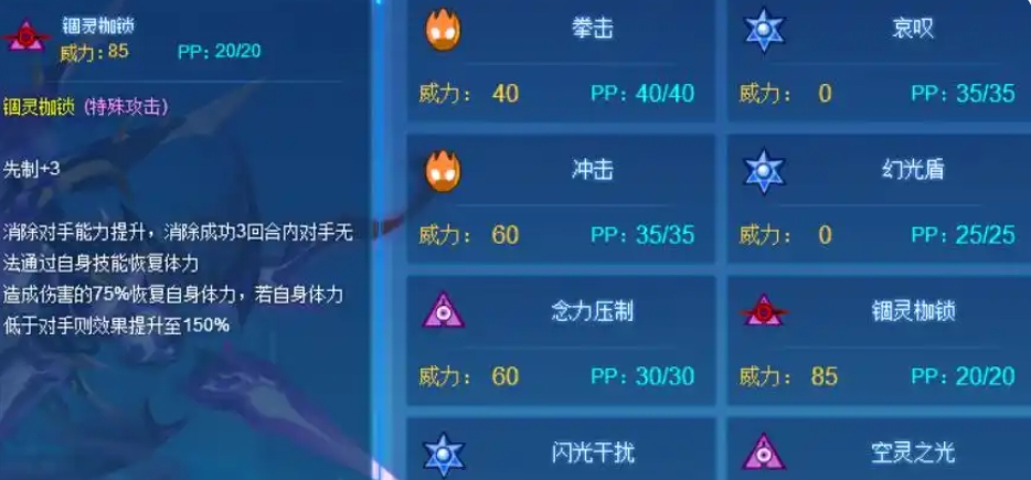 从魂印就能看出这个精灵的强度不凡,再来看它的技能锢灵枷锁,这是一个先3消强的技能,成功施展后,在接下来的3回合内,对手无法通过自身技能恢复体力。同时,造成的伤害的75%会恢复自身体力,若自身体力低于对手,则这一效果会提升至150%,先3的基本效果是稳定的回血补偿,不过这需要高额的红伤来反馈,但75 - 150%的续航能力着实不容小觑。