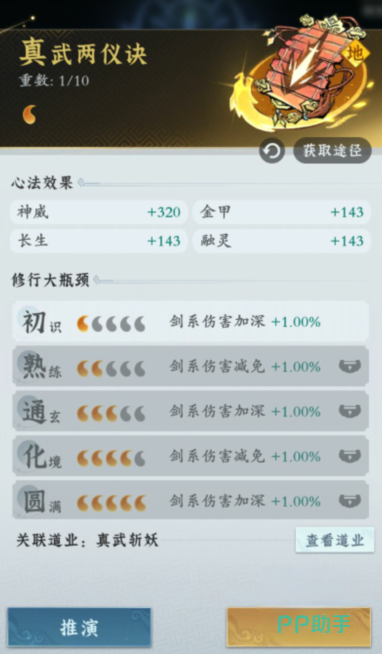 神通搭配完成以后,小伙伴们就需要考虑其它的事宜了。如果想要自己选择的神通能够发挥出更大的作用,那么心法也是一个十分重要的关键节点。小编在这里推荐真武两仪诀,它的作用是提高剑法所携带的威力,并且还拥有少量的防御属性。