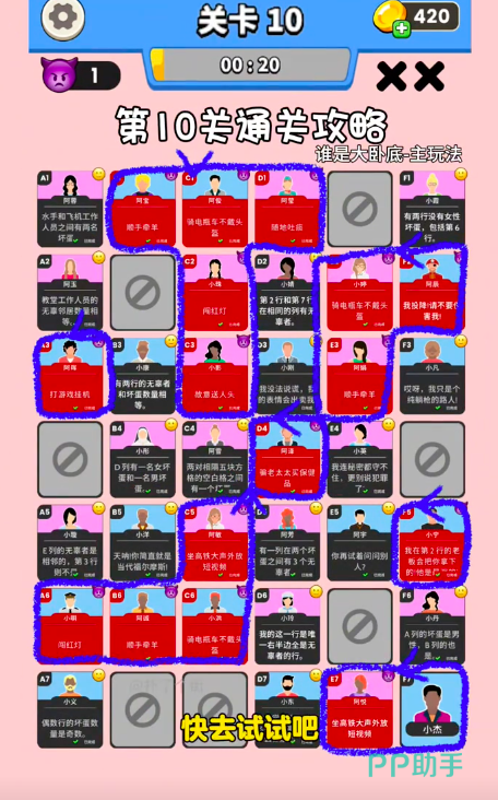 在下方分享的这张图片就是第十关当中所有坏蛋的位置所在地,玩家目前可以通过其相邻角色的情况进行整体推断,由此来看难度并不是很高,不过我在推动过程中如B5、E5、F3这些角色提供的参考资料意义并不是很大所以还是需要玩家以综合形式来进行相关信息的判定,总的来说第十关的游戏难度还是偏高的。