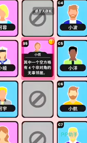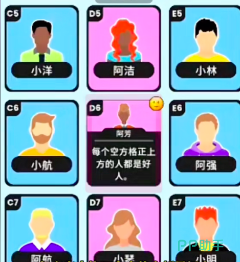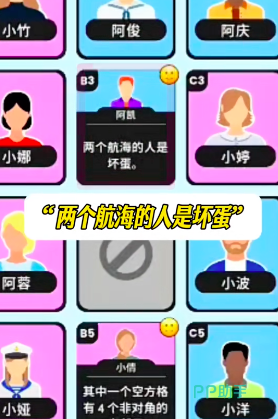 而另一条线索是其中一个空方格有四个非对角的无辜邻居,这就需要玩家们根据空方格的位置来初步判定其对角位置的相关人员。小彤的描述是地列有一名女坏蛋和一名男坏蛋,玩家可以将目标所致地列第二第三第五第六第七都可以判断出好人,因此男女坏蛋是阿莹和阿泽,这种相邻判断思路在这款游戏当中的使用频率还是非常高的,因为篇幅有限,小编在下文中揭秘一下这坏蛋的具体位置喽。