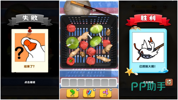 这款游戏以别具一格的新奇模式呈现消除游戏的快乐,各位玩家将面对一个布满各种物品的框中,通过移动物品至屏幕下方的卡槽之中,实现三个相同物品消除。游戏娱乐模式类似曾经火热的羊了个羊设定,却在它的基础上创意满满的融入了众多新鲜的元素,令大家可以体验别样奇妙生动的快乐。消除的元素也是各种食物乃至大鹅。