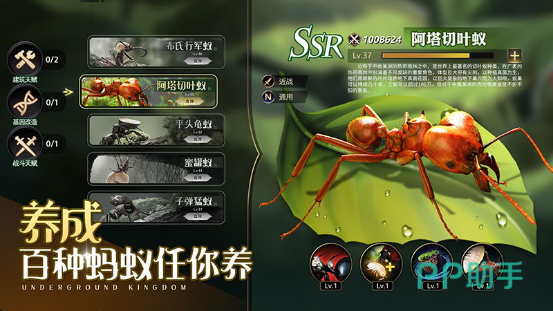 玩家担起蚁巢主人的角色,从第三视角操纵蚂蚁世界,引导蚁族搭巢、繁殖、觅食,感悟蚁族的忙乱不失序。同时可孵化饲养蚂蚁,组建专属军团,同盟友齐心作战,防御敌袭,拓展领地,打造地下蚂蚁王国。游戏中有多彩多种类的蚂蚁兵种,还设有特化蚁系统等,玩法多样,真实还原了蚂蚁的生态和生活场景。