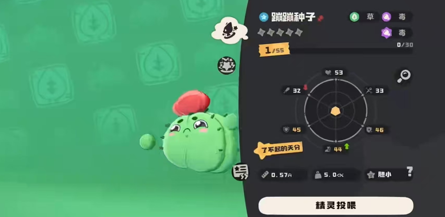 蹦蹦种子是洛克王国手游中非常出息的一种精灵形态,大家可以很轻松的直接捕捉获得。当他等级达到16级时就可以进化成蹦蹦草,蹦蹦草达到32级会进化成蹦蹦花,所以大家感觉比较强势的蹦蹦花,就是由蹦蹦种子最终得到的。作为初级精灵,自然的属性方面比较弱,种族值一共只有351点,生命值属性比较高,也算延续了这一系的特点。特性是生物碱,每释放草系技能时,都能为敌方额外附加两层中毒。