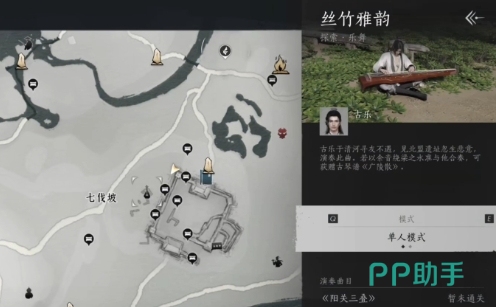 在游戏地图上,玩家会遇到一些以乐器探索玩法,图标通常会在风景优美的地方出现,如山间小亭、湖畔凉亭等。玩家只需靠近这些图标并按下互动键,便能与NPC对话,对话后,NPC会邀请玩家进行丝竹雅韵的挑战。