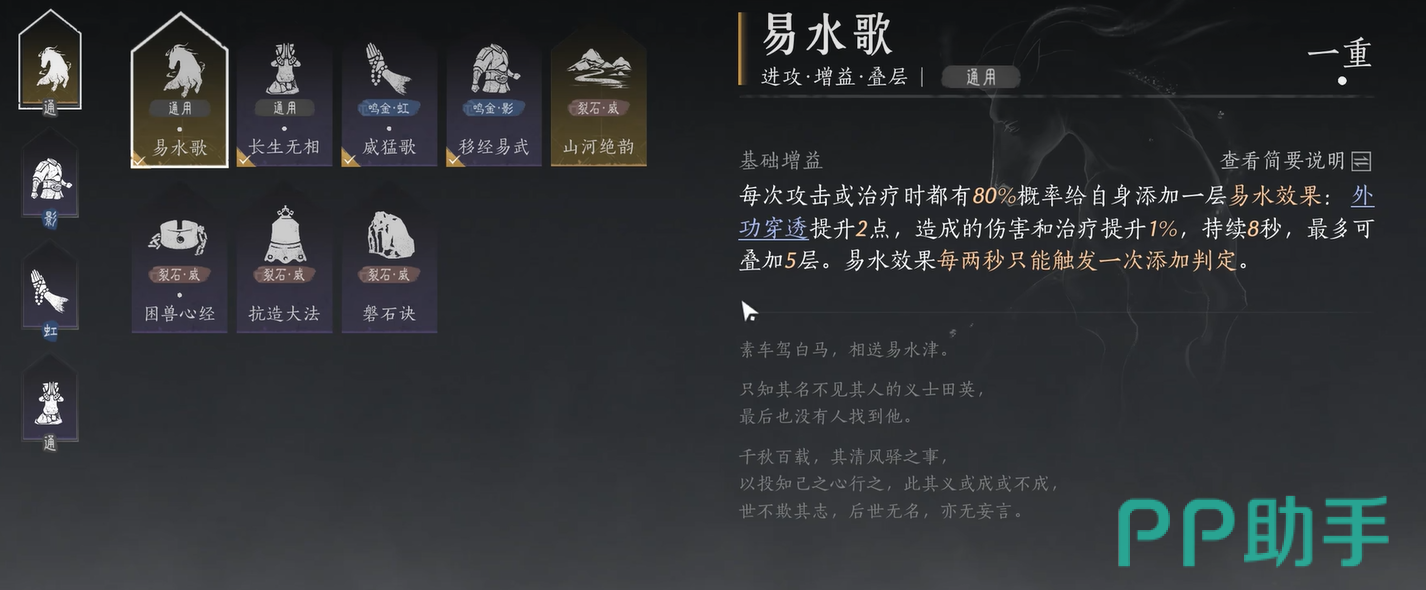 心法搭配方面,陌刀输出流的核心是爆发力,推荐优先选择易水歌或四时。易水歌能稳定提升爆发能力,而四时虽然覆盖率略低,但在特定场景下表现不错。除此之外,抗造、威猛歌和移经易武是三大推荐心法。其中,抗造提供稳定增伤,威猛歌和移经易武则优化输出节奏。需要注意的是,金色防御类心法并不适合陌刀输出流,这个流派的精髓在于防御靠走位。