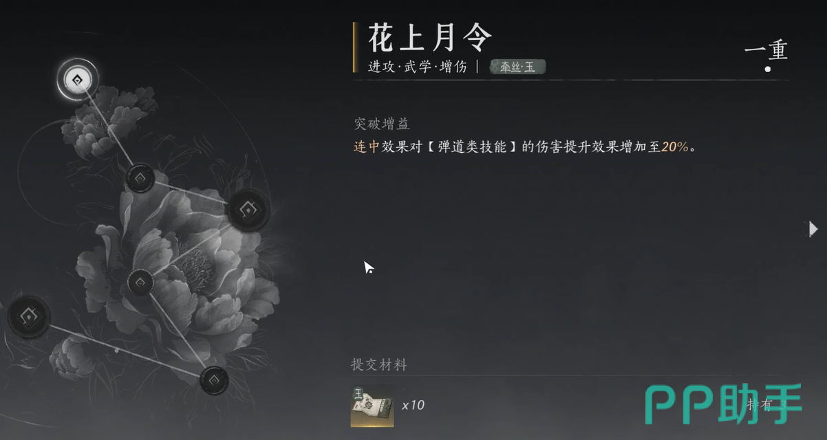 搭配心法的核心思路就是提升输出伤害、优化耐力循环,并加强技能的续航能力。推荐的三本心法分别是花上月令、威猛歌和燎原星火。首先是花上月令,它可以说是九重春色的灵魂拍档。装备后,招式“抛春恨”能够增加至两层充能,瞬间提升技能灵活性。而且每当技能命中敌人时,还会使敌人受到的弹道技能伤害额外提升。如果你喜欢一套爆发流输出,这本心法的加持绝对不会让你失望。
