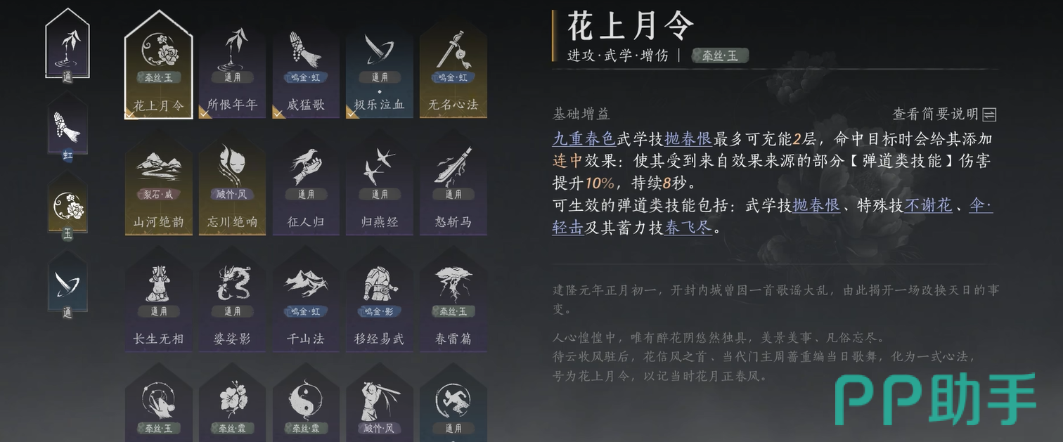九重春色的核心在于精准打击与持续输出,所以心法的选择要平衡增伤和续航。推荐主流搭配为花上月令、威猛歌和燎原星火,这种组合在副本、野外打怪和PVP等多场景下都表现稳定。如果追求更多操作上的趣味性,可以替换其中一本心法为所恨年年或者四时无常,增强技能的多样性。