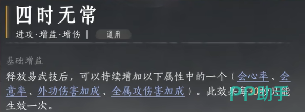 如果你更偏好属性随机增强,可以选择四时无常。它在易武技后的爆发增强非常亮眼,每30秒触发一次效果,能让会心率、外功伤害等属性随机提升一项。这属于锦上添花型的心法,更适合需要多维度属性加成的玩家。如果热衷于“春尽山空”招式,葫芦飞飞则是个不错的选择。它为招式增加两层充能,虽然调息时间会延长,但也能让输出策略更加灵活,适合喜欢细节操作的玩家。