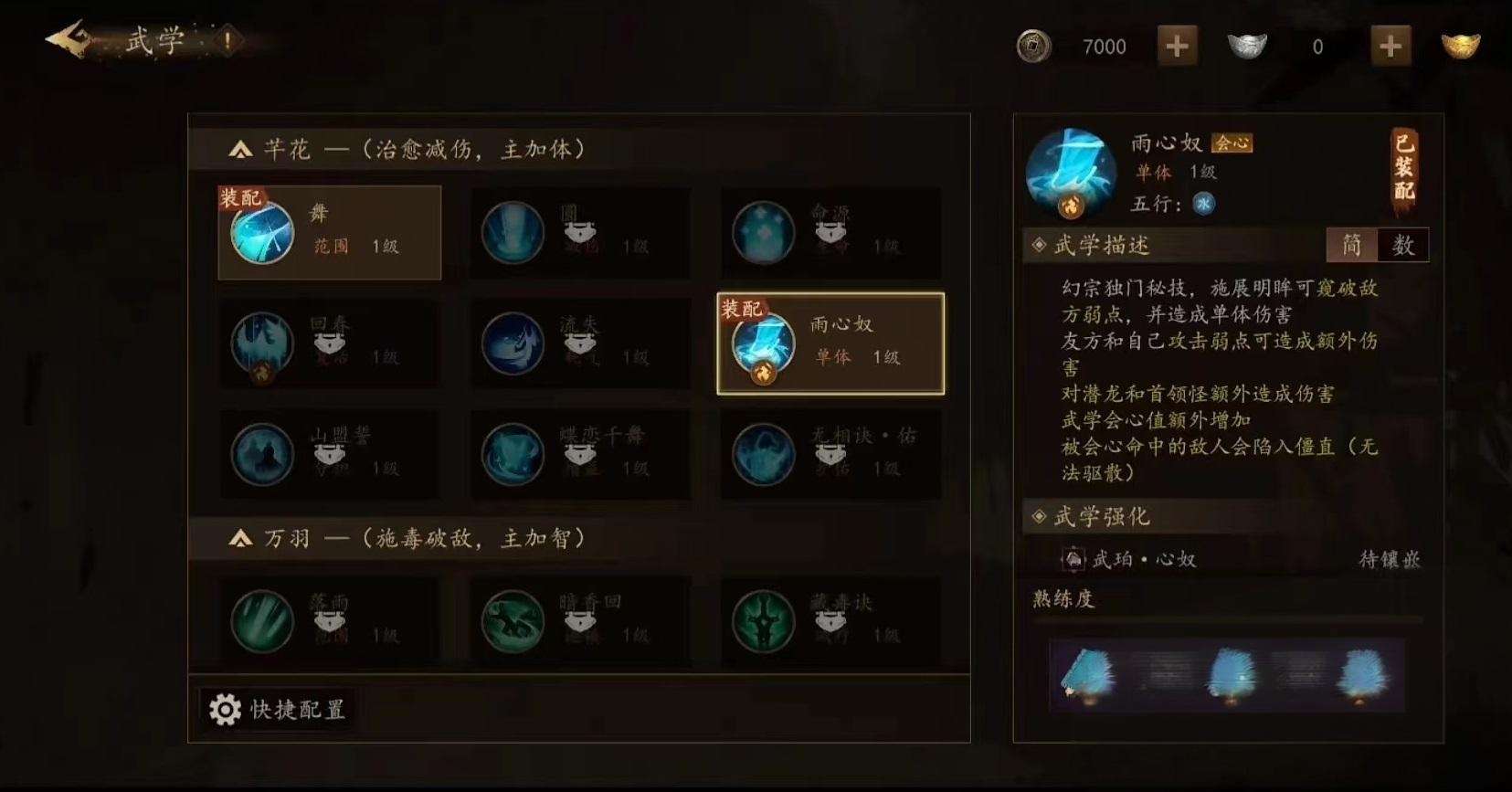 万羽的技能分别是落雨、暗香回、藏毒决、驱渊鱼,这四个技能都是都是属于攻击技能,其中藏毒决和驱渊鱼都是毒攻技能。