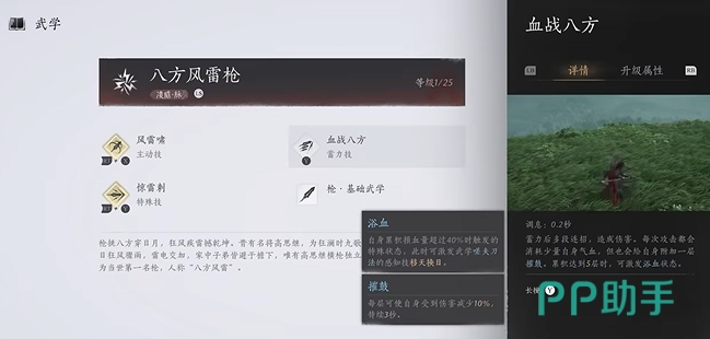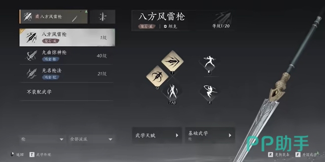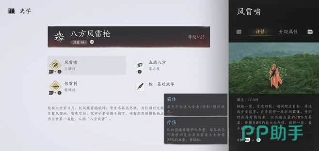 八方风雷枪法则更加注重防御与生存能力,被定位为承伤类武学,适用于那些愿意站在前线上挡下敌人进攻,同时对敌人造成伤害的玩家。八方风雷枪法的技能如下: