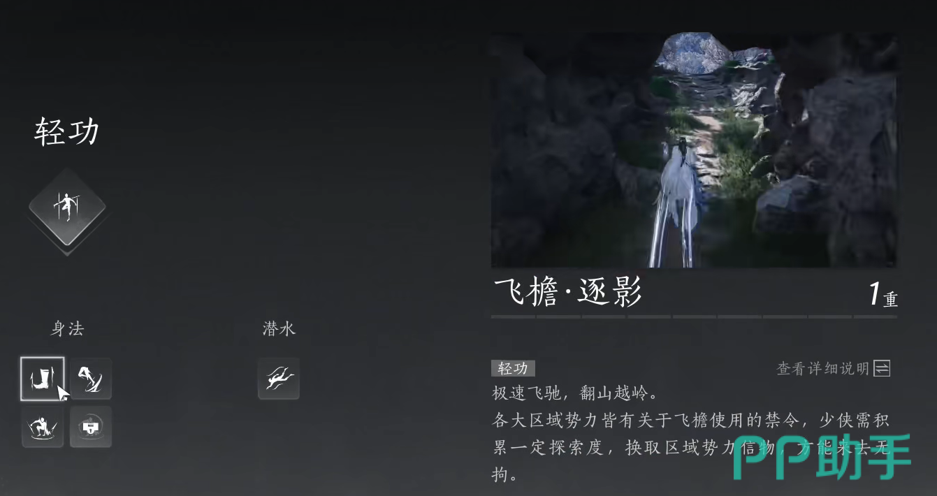 另一个重要的点是,飞檐逐影技能虽然可以让你在地图上快速移动,但在战斗中却无法发挥作用。这是一个探索和机动性的技能,因此,只有在非战斗状态下,你才能尽情享受飞檐逐影带来的自由与快速。