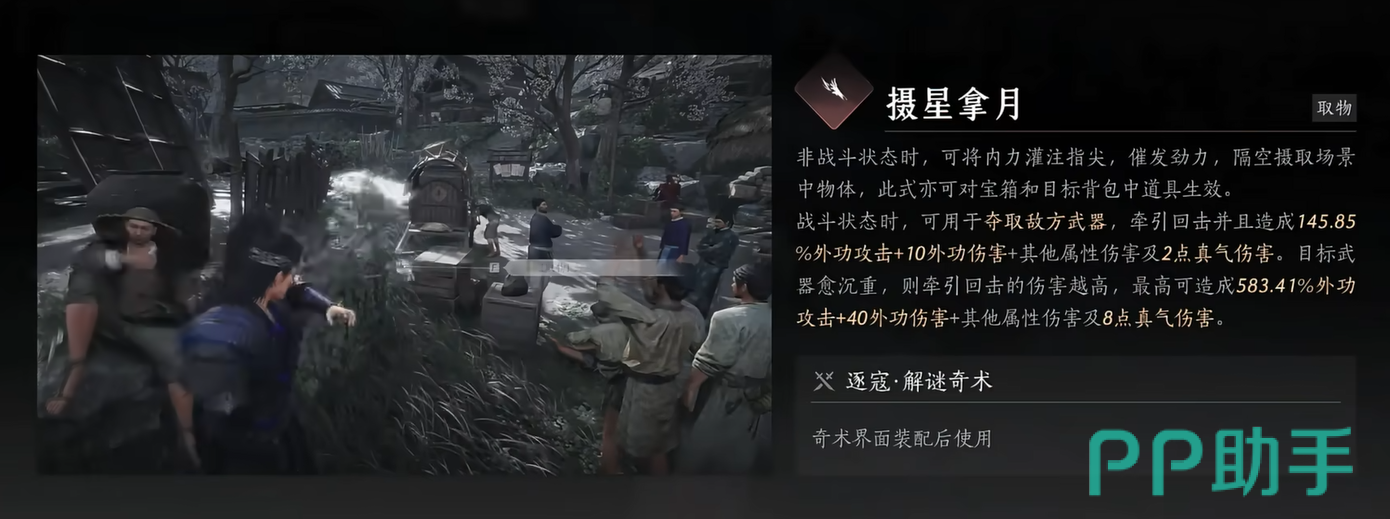 摄星拿月的强大程度真不容小觑。这项技能让你能够通过内力操控外界物品,在战斗中可以轻松卸掉敌人手中的武器,甚至一记回击还能让敌人瞬间体验飞天的感觉。最酷的是,日常里你还能用它轻松取到那些远处够不着的宝物,简直就是一个远程收割机。
