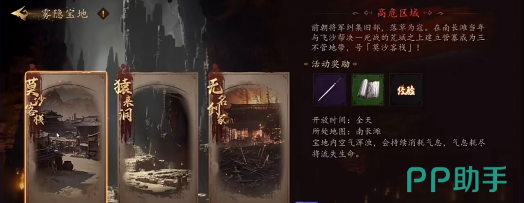 雾隐宝地是一个副本入口,在雾隐宝地里面有3个副本可以选择,这三个副本分别是漠沙客栈、猿来洞以及无名剑冢等地方,这三个地方在游戏里面是高危副本,同时刷这个三个区域玩家所获的回报也是极为丰厚的。