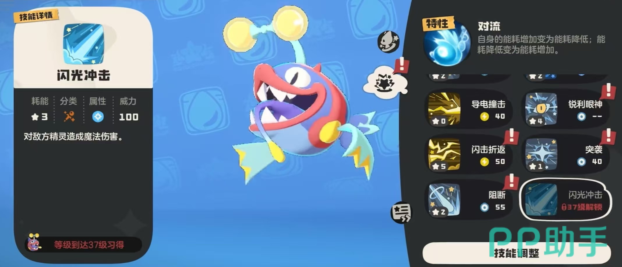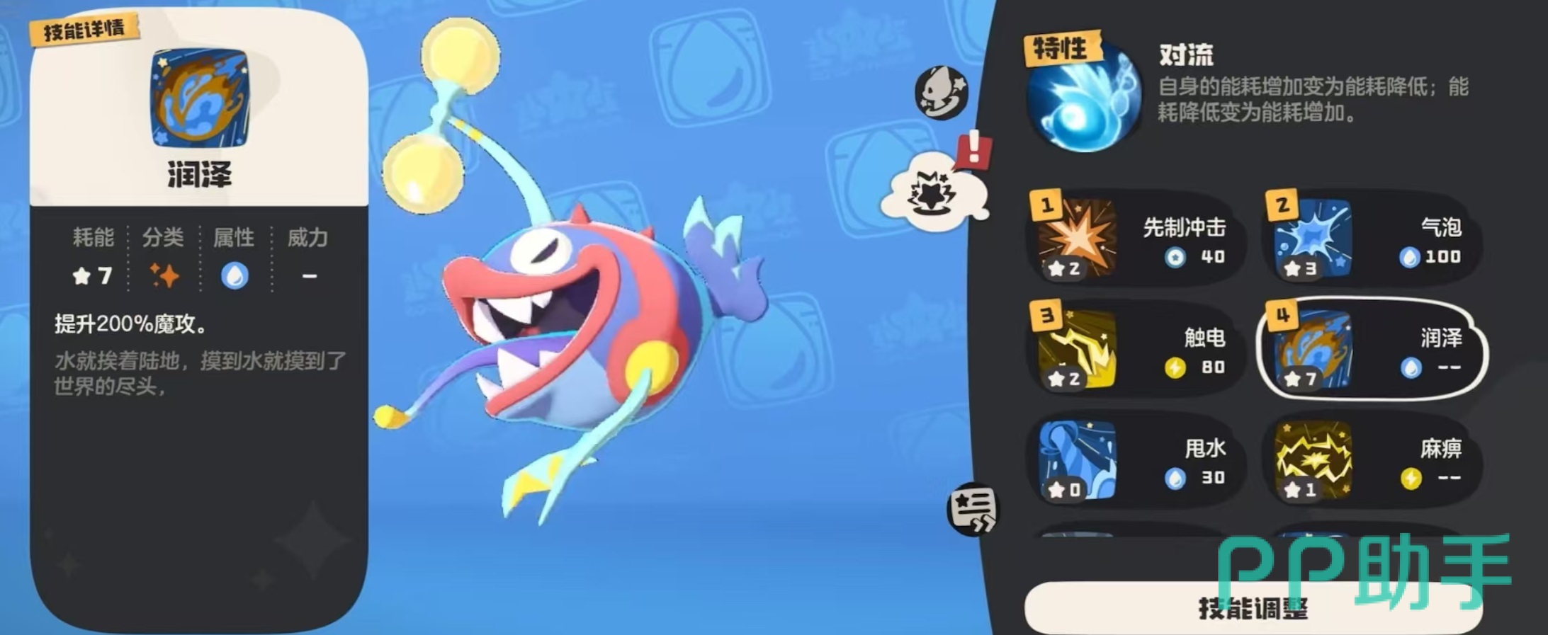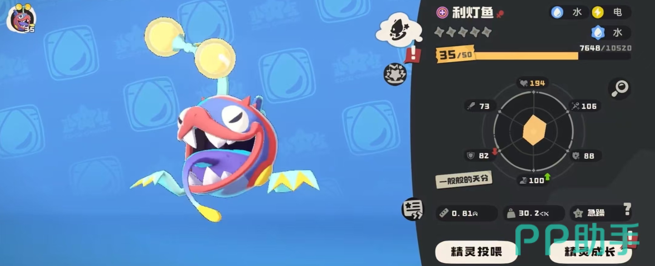 利灯鱼的特性为对流,自身能耗增加,变为能耗降低;能耗降低变为能耗增加。这个特性非常有趣,也就是说所有使其能耗增加的效果,最后都会变成能耗降低,相反也是如此,所有能降低能耗的效果,都会变成能耗增加。如果大家使用的时候没有注意到这一特性,很可能吃一个大亏,不过明确了之后就没有问题了。他的种族值一共为583点,生命和魔攻这两项最高,在110点左右,其他属性物攻是最低的,另外几项都比较均衡,为95点左右。