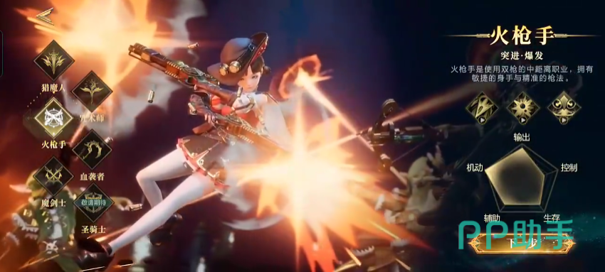 火枪手是中距离作战的强者,他们擅长在作战中使用火力压制对手。尤其是在与敌人产生僵持的情况下,他们更善于突进和打出爆发,能打敌人一个措手不及。初始技一”狂热射击”,使用后快速朝着前方开火,对前面的对手造成伤害,且让敌人的移速降低一段时间。”连环射击“则是,可以连射多次,打出多段的伤害。