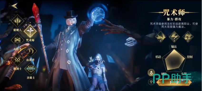 咒术师是一种掌握着古老咒文和禁忌之力的职业,使用法杖的武器,在远距离就能对敌人造成毁灭性的打击,暴力和群攻就是他们的标志,每一次施法都是一次暴力美学,对元素的操控炉火纯青,能精准的触动对手灵魂深处的恐惧。擅长远程进行精准的打击,也能迅速的覆盖范围广阔的强力魔法。