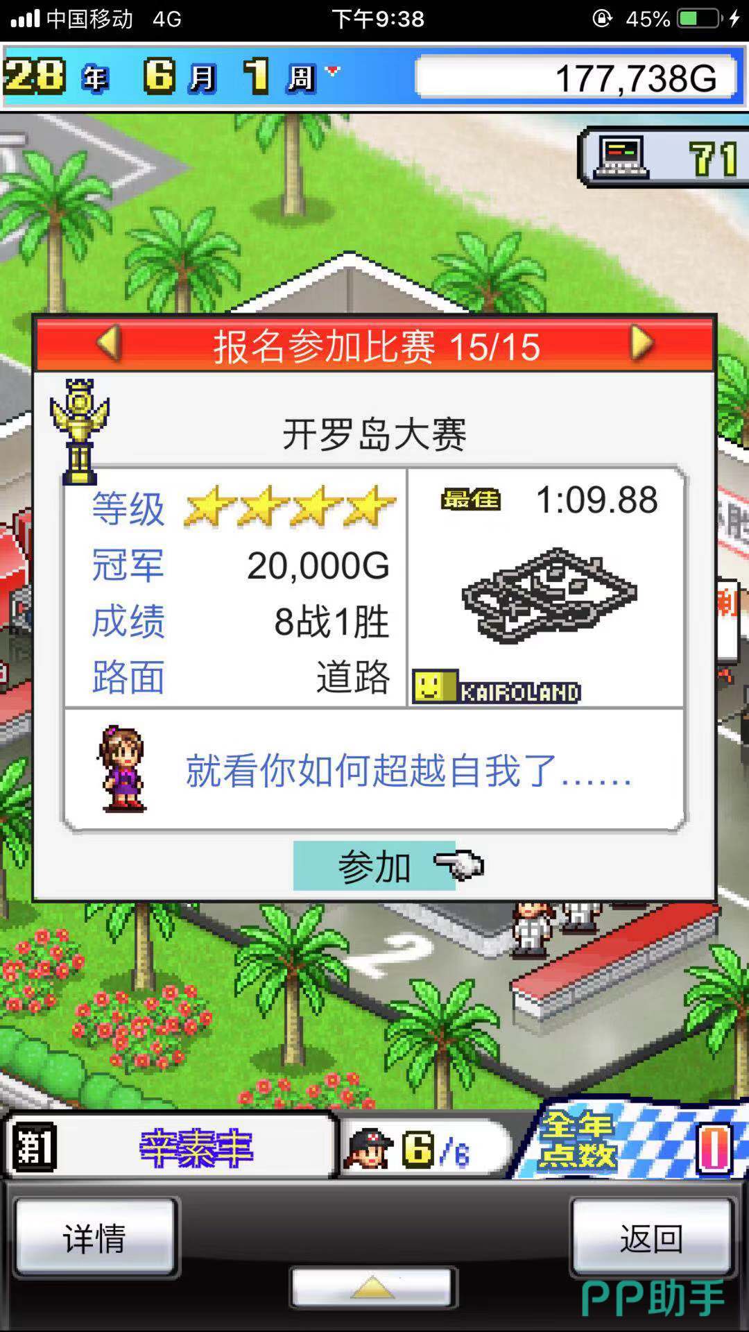 车手爆气:即使把车手放着不动,过几周年他也会爆气,但是这种方法显然太慢了,我们让车手不停的参加比赛或者进行工作都可以加大车手爆气的概率,车手爆气之后就放着别让他干活了,不然他的爆气效果会用在别的地方,赶紧点击开罗岛比赛并且参加。