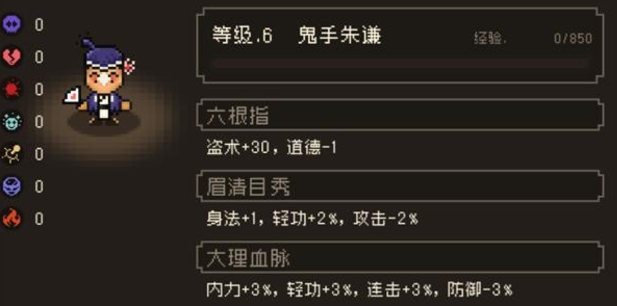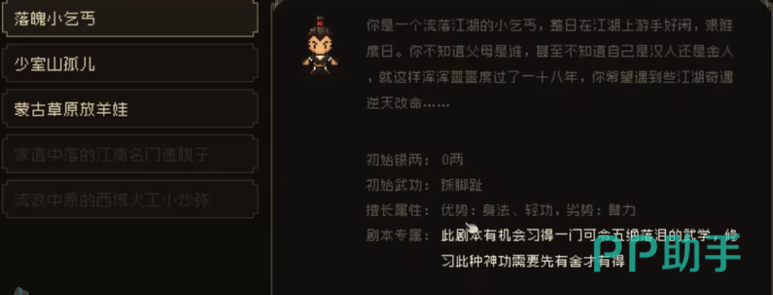 开局可以选择自己的出身,分别是小乞丐、孤儿和放羊娃,小乞丐擅长身法和轻攻,劣势是臂力,选择他有机会学习一门来自西域的邪门外道武学,孤儿的优势的臂力,缺点是身法,选择他能学习一门佛家的武学,最后的放羊娃优势是道德、定力,劣势是悟性,选择他能学习精明但不成方圆的武功;