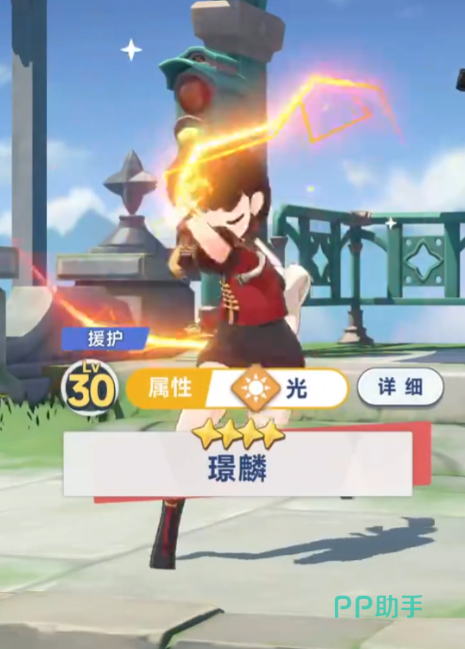之后大家只需要按下Q,就可以直接召唤出璟麟了。他的动作也特别呆萌可爱,可以直接朝着前方中央区域发射一个光属性的魔法阵。然后删除魔法阵中的敌人就会持续受到电击伤害,而且还带有一定的麻痹效果,之后持续不断电疗对手。